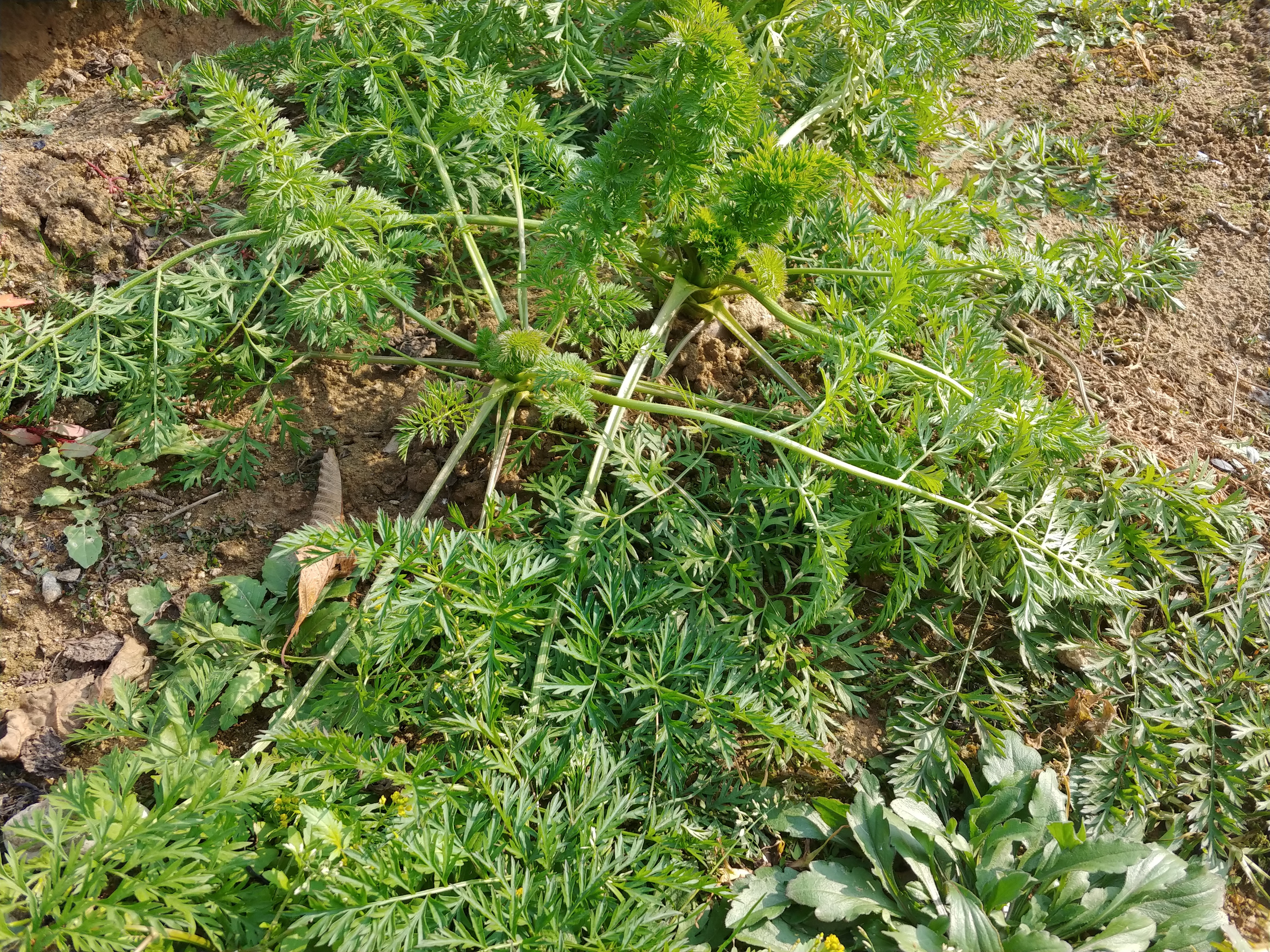 당근이 주변에 여유가 있으니 줄기가 위로 서지 않고 옆으로 뻣는다. 두께도 팔목만하다