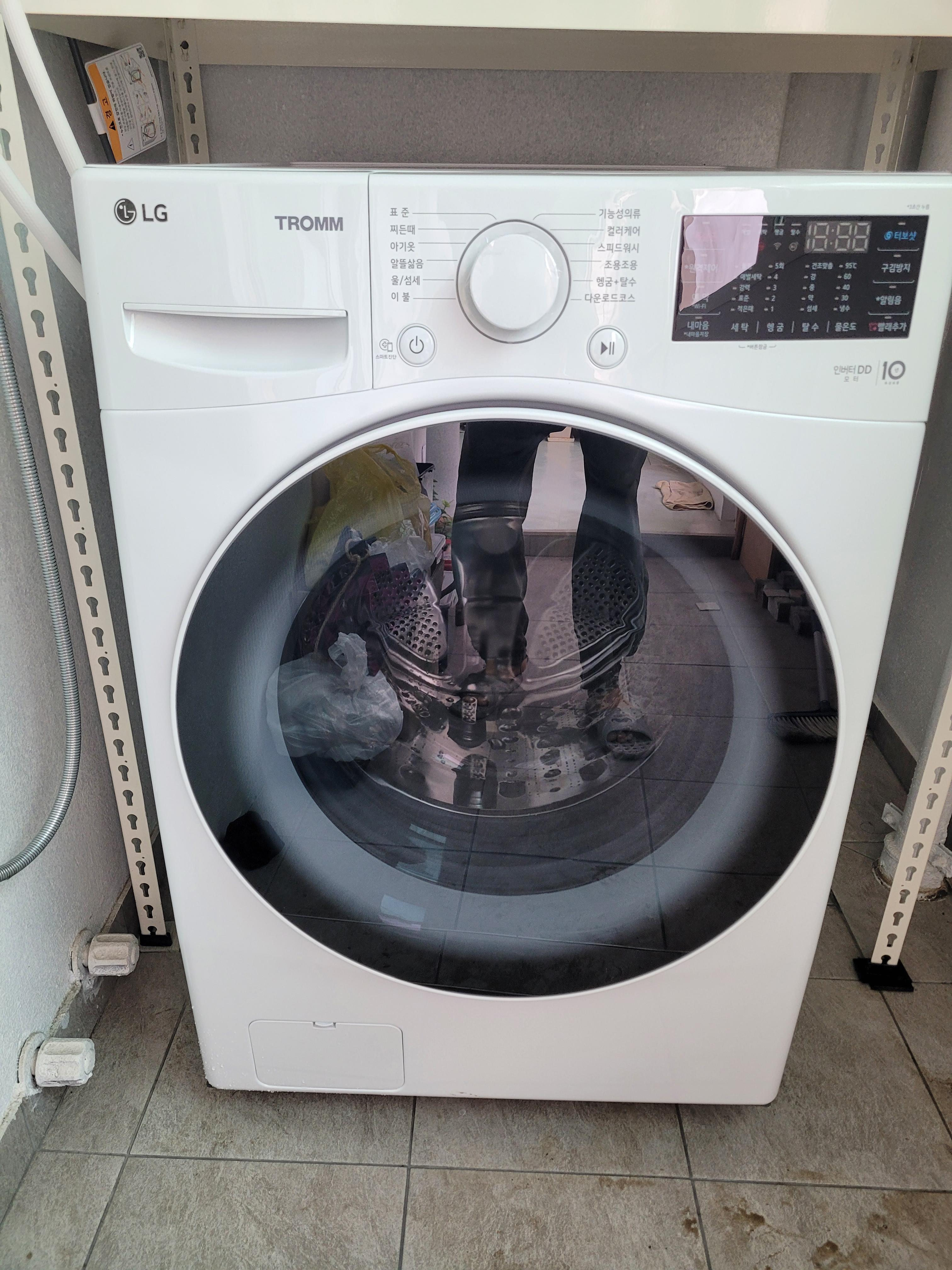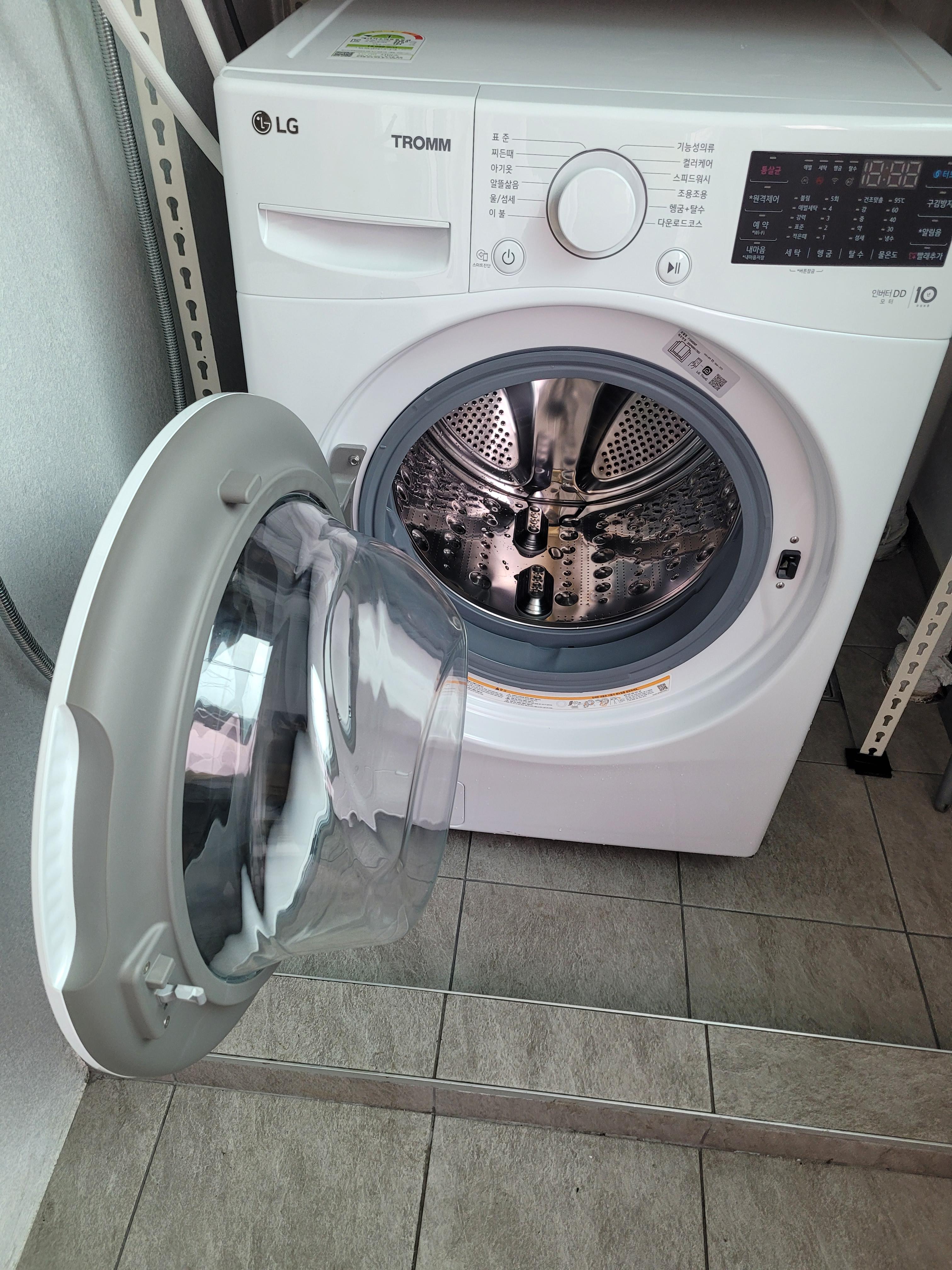 방바닥에 문제 없이 기존 세탁기가 나가고 새로운 세탁기가 자리를 잡았다.