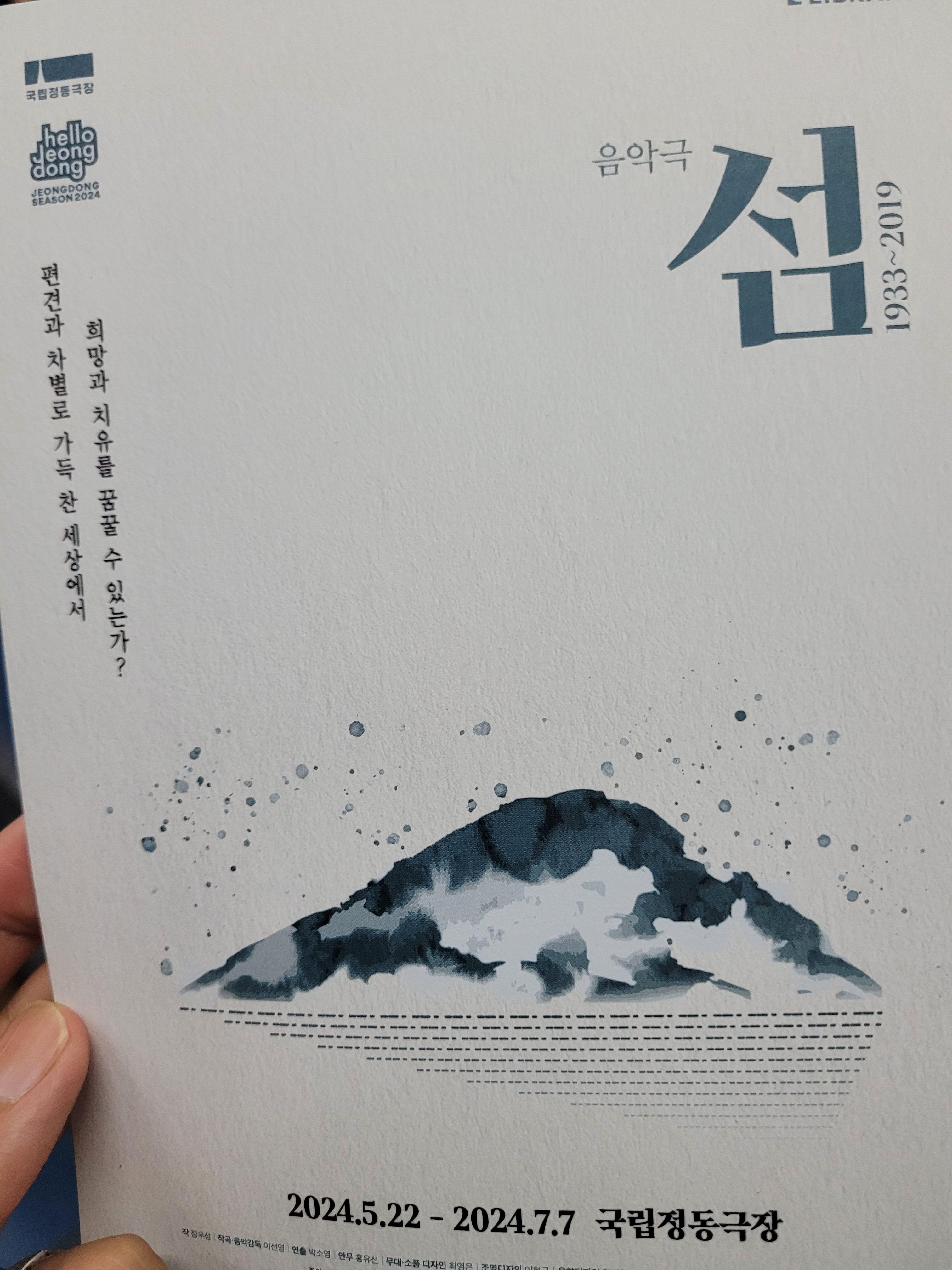 음악극 - 섬:1933~2019 장르 음악극 공연일시 2024.05.22 ~ 2024.07.07 공연시간 화·목·금 19:30|수 15:00, 19:30|토·일·공휴일 14:00, 18:00 / [*공연없음: 6.23(일) 18:00, 7.7(일) 18:00] 소요시간 약 115분 예정 (인터