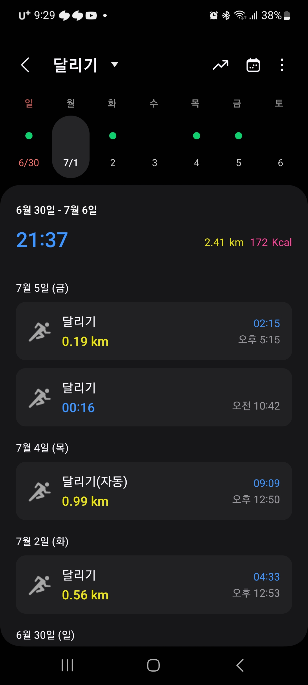 달리기 주3회 총21분37초 달렸다. (기존 최대 41분/1주)