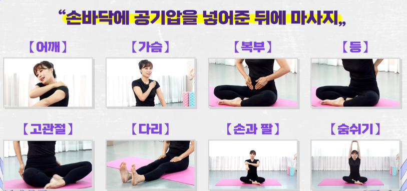 손에 공기압을 넣어 어깨, 가슴, 복부, 등, 고관절, 다리를 두드리며 세포 활성화.