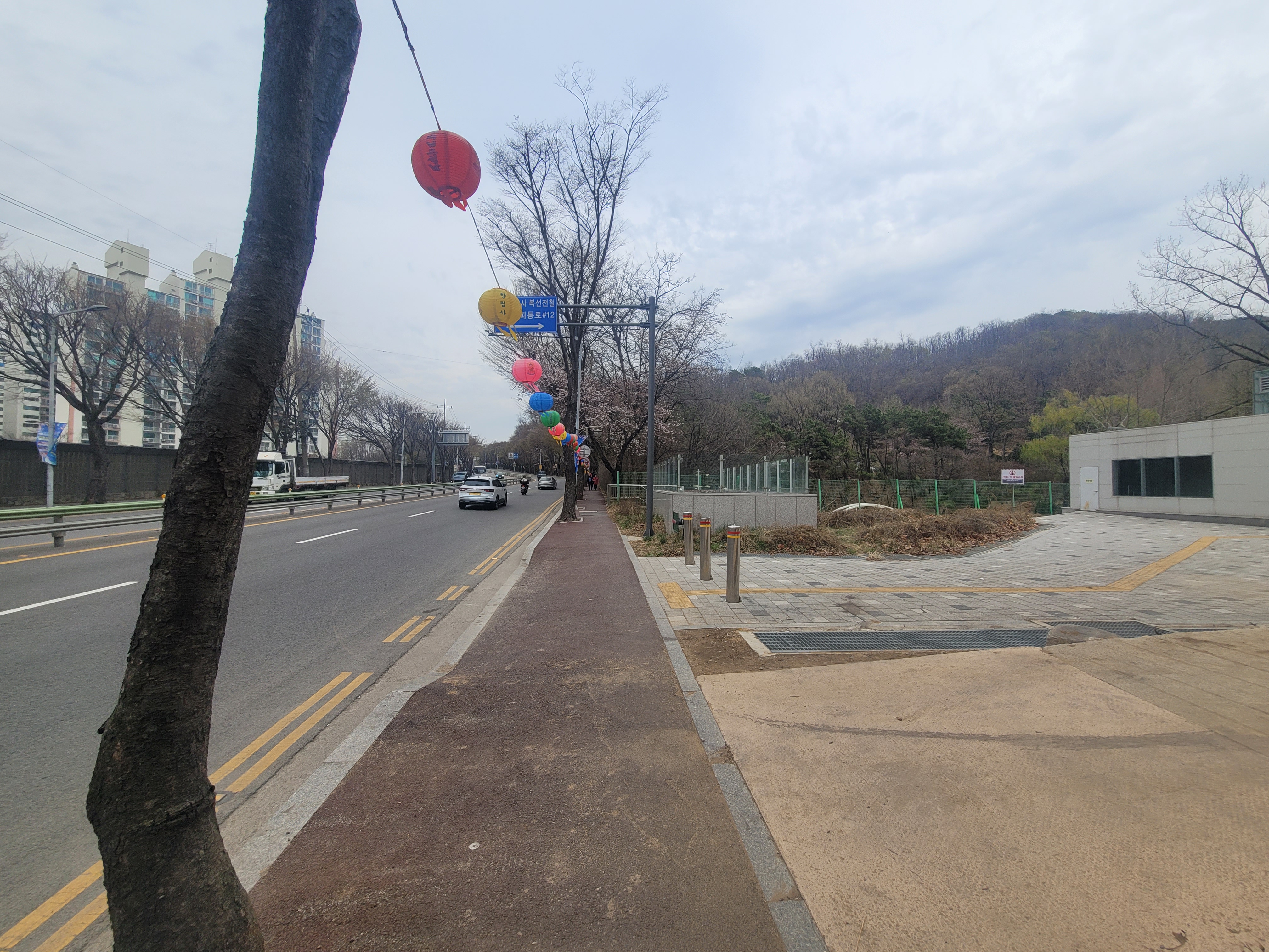 공원 위에 도로와 절 진입로가 있어 잠시 아이들 내려주고 간다면 가능은 할 것 같음