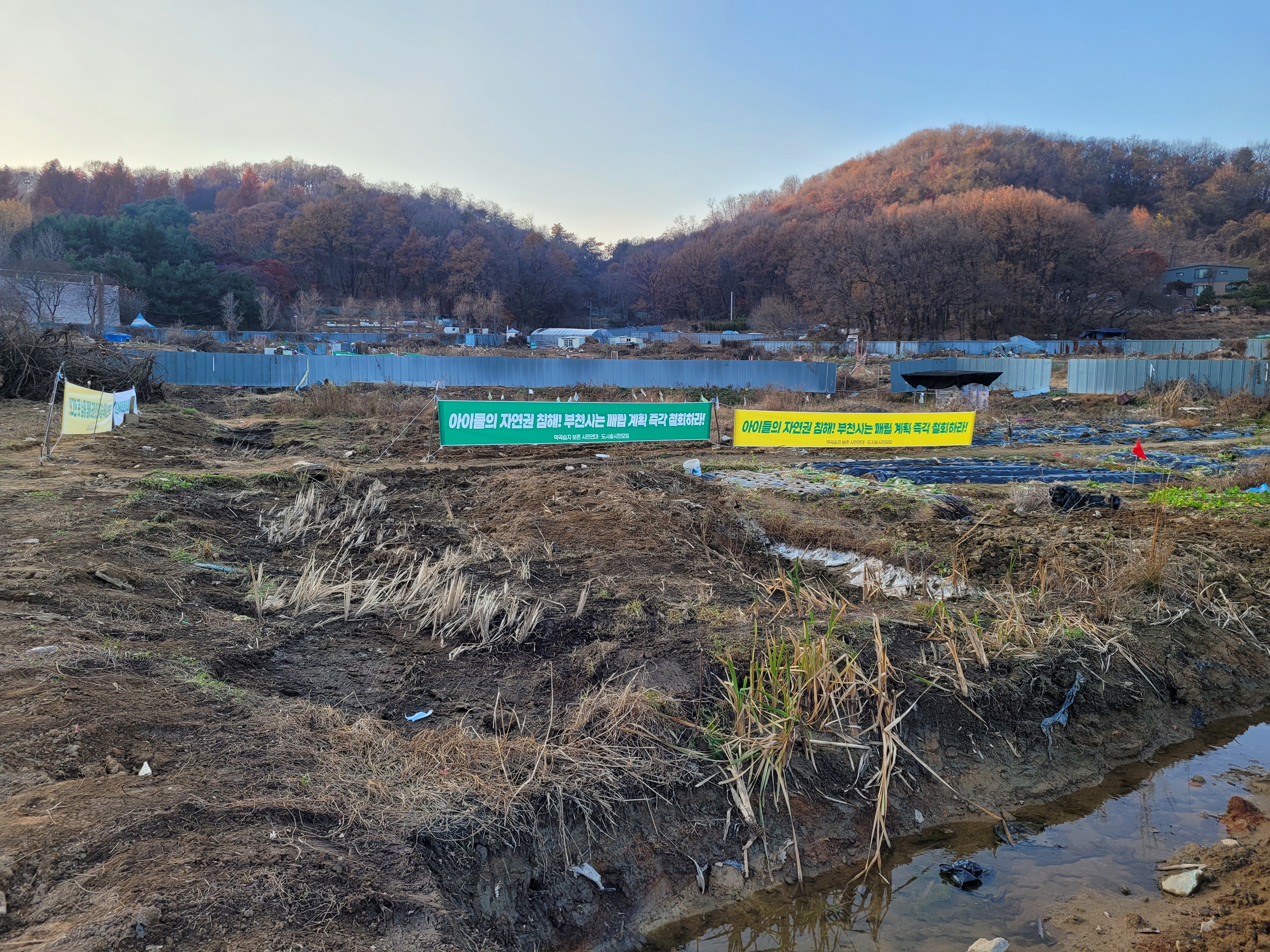 센터 아이들과 습지 매립 반대 현수막 설치